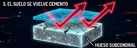 ¿El problema? Que al volverse tan duro, pierde su capacidad de amortiguar. Se convierte en un yunque. Ahora, cada paso que das es como martillear un cristal (tu cartílago restante) contra un bloque de cemento (tu hueso esclerótico). Esto acelera la destrucción mecánicamente, cerrando el círculo vicioso.