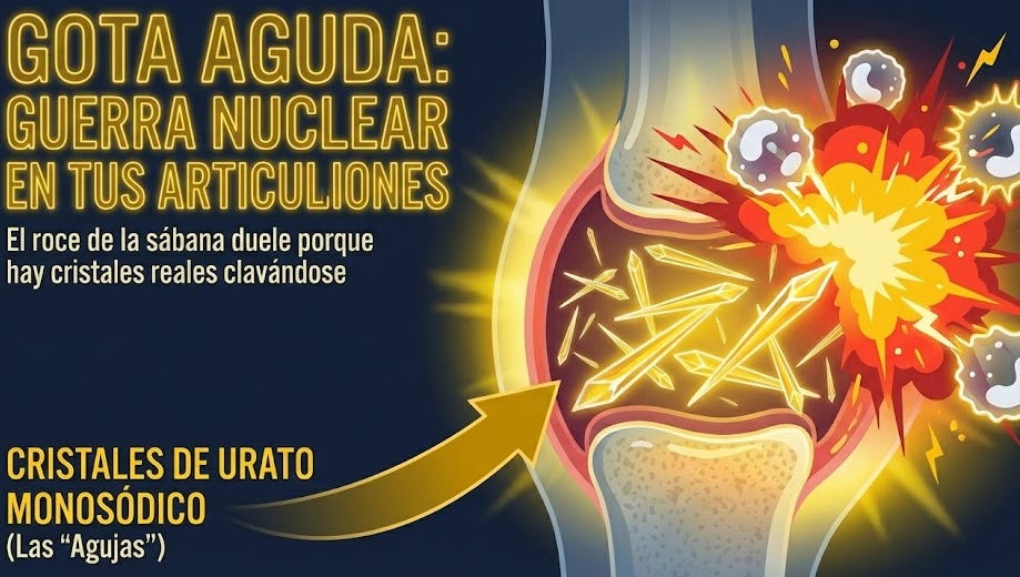 Es como si dentro de vuestras articulaciones alguien mete miles de agujas microscópicas. Agujas reales, cristalinas y punzantes. Y que provocan una inflamación tan bestia que el simple roce de la sábana contra el dedo gordo del pie a las tres de la mañana te hace ver las estrellas.