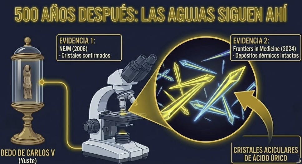 ¿Qué encontraron? Cristales aciculares de ácido úrico. Las agujitas. Ahí estaban, cinco siglos después, intactas dentro del dedo del emperador. La prueba forense definitiva de que Carlos V tenía gota severa.