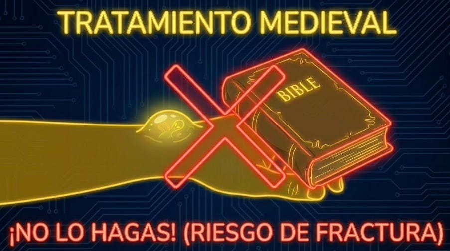 El tratamiento estándar de la época (y no estoy de broma) consistía en que el paciente ponía la mano en la mesa, cerraba los ojos, y el “médico” (o el abuelo de turno) cogía la Biblia y le arreaba un golpe seco y brutal directamente sobre el bulto.