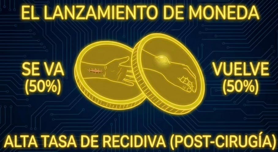 Las estadísticas dicen que, incluso con una cirugía perfecta, hasta el 50% de los gangliones vuelven a salir. Es lanzar una moneda al aire. Cara: se va. Cruz: vuelve a salir, y encima ahora tienes una cicatriz y riesgo de que te duela la zona por haber tocado nervios sensibles.