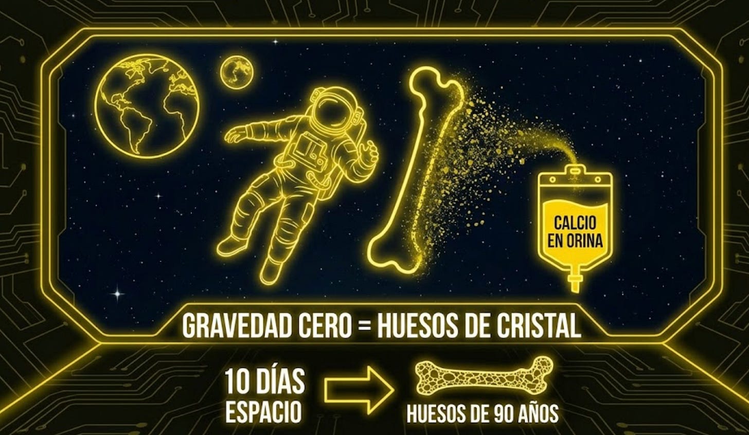 Astronautas pierden 1-2% de masa ósea AL MES en gravedad cero. El calcio se disuelve del hueso y sale por la orina (hipercalciuria), aumentando riesgo de piedras renales.Space Flight Calcium: Implications for Astronaut Health