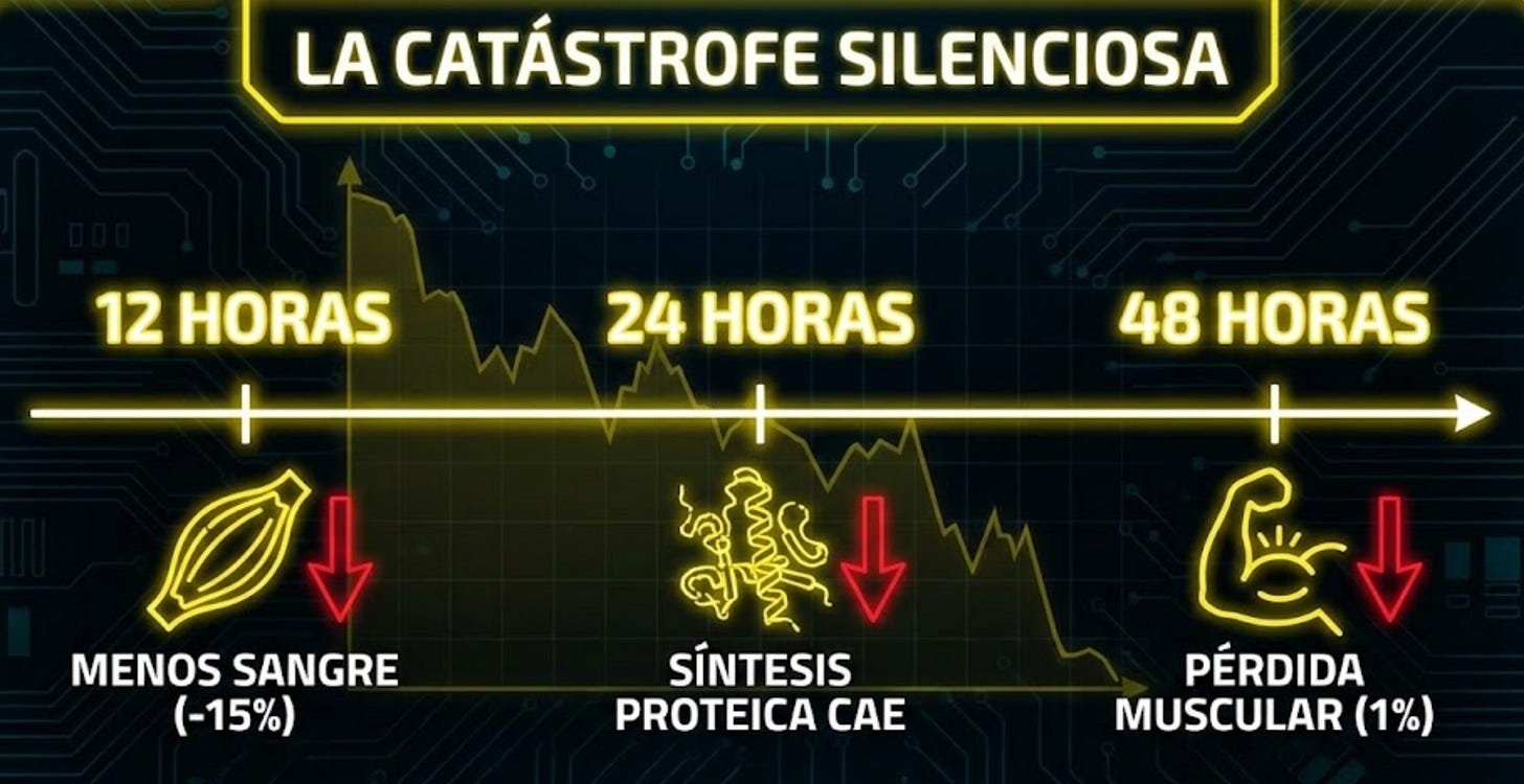 Fase 1: sarcopenia aguda. Imagina un restaurante que pasa de tener 100 clientes a tener 10. ¿Qué hace el dueño? Despide a los camareros. Tu cuerpo hace lo mismo. A las 12 horas de inmovilidad, reduce el riego sanguíneo a los músculos. A las 48 horas, detiene la síntesis de proteínas.