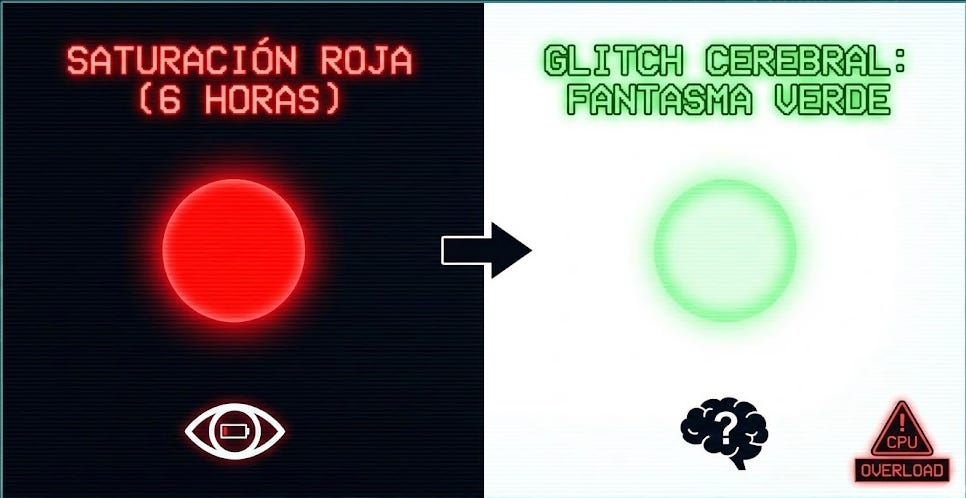 Después de 4-6 horas, esas células se agotan. Se “queman”. Y si de repente levanto la vista hacia una pared blanca inmaculada, mi cerebro entra en pánico por la falta de señal roja e intenta compensar lanzando el color opuesto del espectro.